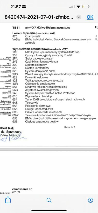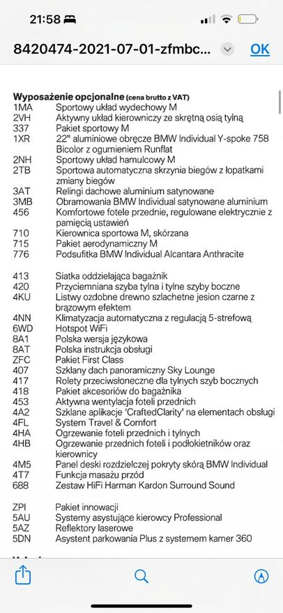 abs, kontrola trakcji (asr), regulacja wysokosci fotela, dzielona tylna kanapa, kierownica wielofunkcyjna, autoalarm, immobiliser, centralny zamek, elektryczne szyby przednie, elektryczne szyby tylne, elektryczne lusterka, swiatla przeciwmgielne, czujniki parkowania - tyl, czujniki deszczu, komputer pokladowy, nawigacja satelitarna, podgrzewane fotele, regulowana kierownica, szyberdach, tempomat, wspomaganie kierownicy, felgi aluminiowe, przyciemniane szyby, relingi, tlumik sportowy, domykanie szyb przy zamykaniu auta, smartcard / hands free / smartkey, regulowana wysokosc podwozia, uchwyt isofix, system start-stop, dach szklany - panoramiczny, automat. hamulec postojowy, bluetooth, blokada drzwi podczas jazdy, automatyczne swiatla, hud (wyswietlacz przezierny), elektrochromatyczne lusterka boczne, elektrochromatyczne lusterko wsteczne, kamera cofania, ogranicznik predkosci, podgrzewana tylna szyba, podgrzewane lusterka boczne, podgrzewane tylne siedzenia, regulowane zawieszenie, stabilizacja toru jazdy (esp), poduszki pow. kurtynowe - tyl, poduszki pow. kurtynowe - przod, poduszka pow. chroniaca kolana, poduszka pow. pasazera, poduszka pow. kierowcy, cb radio, filtr czastek stalych, czujniki parkowania - przod, asystent parkowania, asystent pasa ruchu, czujnik martwego pola, elektrycznie ustawiane fotele, gniazdo usb, lopatki zmiany biegow, poduszki pow. boczne - przod, zestaw glosnomowiacy, swiatla do jazdy dziennej, tempomat aktywny, szyba przednia atermiczna, bas/afu - system wspomagania naglego hamowania, acs - system zabezpieczen po kolizji, klimatyzowany schowek, skorzana kierownica, poduszki pow. boczne - tyl, interfejs Google Car Play, system glosnomowiacy, czujnik zmierzchu, reflektory przednie laserowe, reflektory adaptacyjne, podgrzewana kierownica, wspomaganie ruszania na wzniesieniu, elektrycznie sterowana klapa bagaznika, fotel z funkcja masazu, wykrywanie zmeczenia kierowcy, czujniki cisnienia w oponach, system sterowania glosem, system rozpoznawania znakow drogowych, system ostrzegania przed kolizja, oswietlenie wnetrza (ambient lighting), zintegrowany hotspot WiFi, elektroniczne zegary (wirtualny kokpit), wentylowane fotele